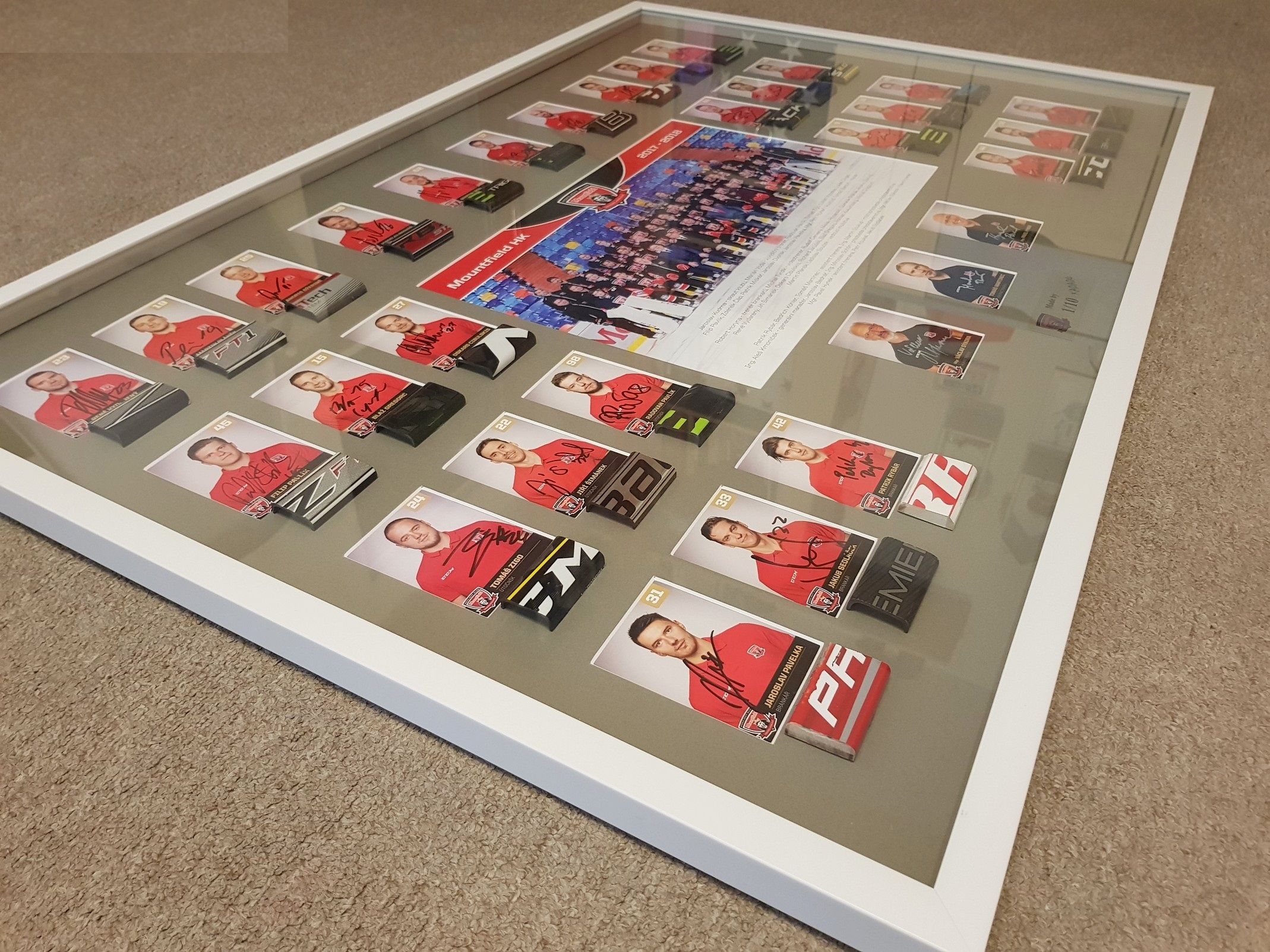 Snad každý fanoušek Mountfieldu HK má nějakou vzpomínku na uplynulý ročník, ve kterém skončil Hradec před branami finále. Jen pár příznivců hradeckého hokeje na ni ale bude moci vzpomínat s unikátním tablem, které je složeno z podepsaných kartiček hráčů a vzorků jejich hraných hokejek. Jeden z deseti vyrobených kusů jde do aukce, může ho získat každý z vás!