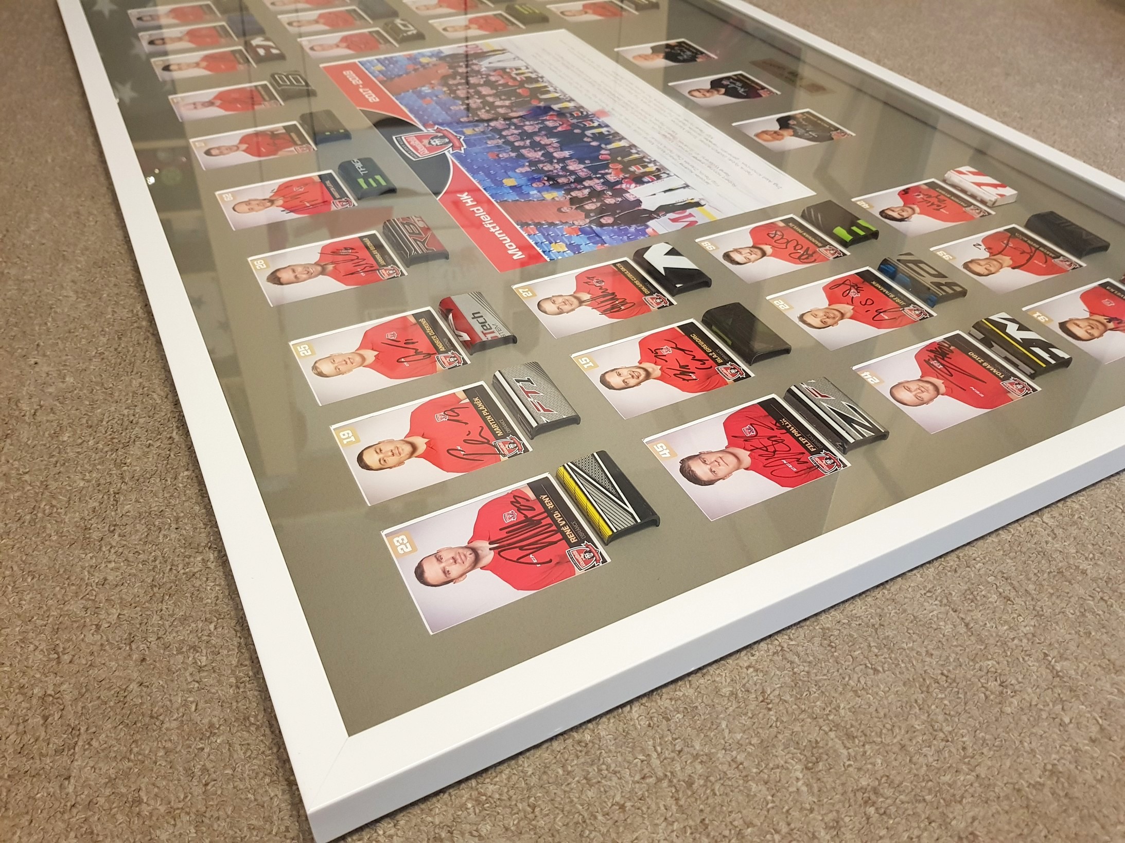 Je 103 cm široké, 78 cm vysoké a vlastnit ho bude jen deset osob! Originální obraz obsahuje týmovou fotku a navíc klubové kartičky kompletního A-mužstva včetně trenérského týmu ze sezóny 2017/18, které jsou opatřeny vlastnoručními podpisy. Celkem se na tablo vměstnalo 28 hráčů a 3 trenéři. To ale není všechno! U každého z hokejistů totiž naleznete kus jeho originální hrané hokejky!