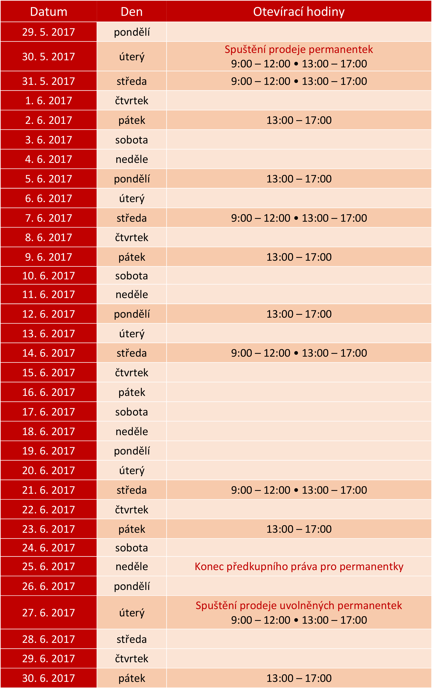 Permanentní vstupenky jdou do prodeje v úterý 30. května 2017 v 9:00, a to na pokladnách FORTUNA arény i prostřednictvím on-line aplikace. Majitelé loňských permanentek mají svá místa rezervovaná do 25. června 2017 do 23:59, do tohoto data mohou uplatnit předkupní právo. Poté budou nevyzvednuté rezervace uvolněny do volného prodeje, který odstartuje 27. června v 9:00.