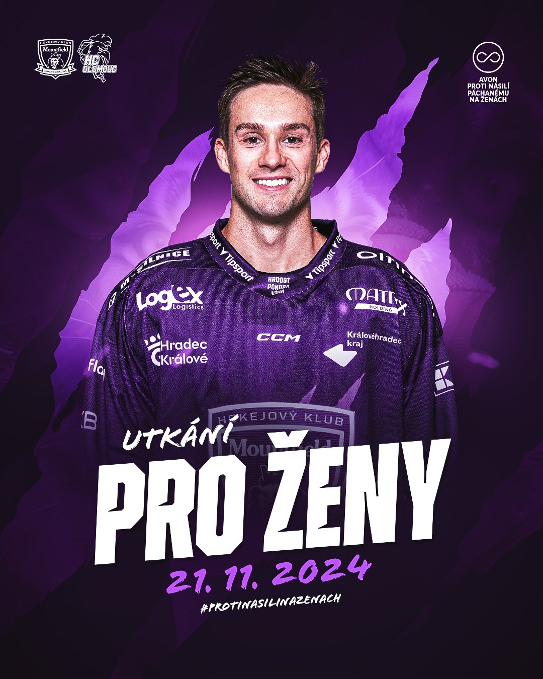 Ve spolupráci se společností AVON již od letních měsíců připravuje Mountfield HK speciální utkání, které bude určeno ženám. Východočeši v rámci 21. kola přivítají ve čtvrtek 21. listopadu na svém ledě Olomouc, a to ve speciálních fialových dresech na podporu boje proti násilí na ženách. Všechny dámy se navíc mohou těšit na slevu 50 % v rámci vstupného, a to do všech kategorií!