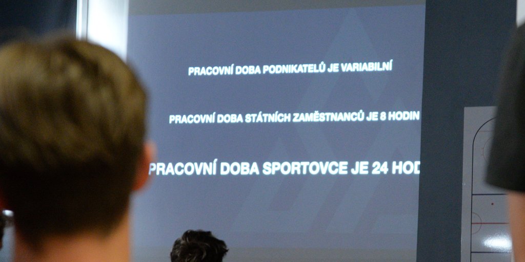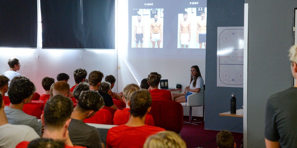 Po tréninku se obě kategorie sešly v VIP prostorách ČPP Arény v místnosti, ve které obvykle polykají tréninkové dávky, co se videopřípravy týče. Nyní tomu bylo jinak. V místnosti je totiž čekala zhruba hodinová přednáška na téma sportovní výživy a její důležitosti pro výkony nejenom na ledě.