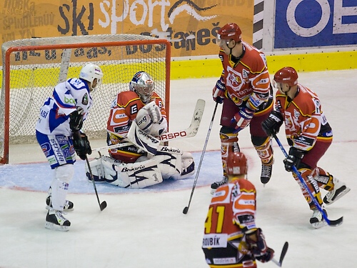 Druhé derby během týdne venku a hradečtí hokejisté opět vezou body a tentokrát dokonce všechny tři. Hradec o svém vítězství prakticky rozhodl v první třetině, kterou vyhrál 2:0. V dalším průběhu utkání hrál stále aktivně a nedovolil domácím jejich nátlakovou hru. Po utkání byl tedy hradecký trenér Pavel Pazourek velmi spokojen. ,,Jsme velmi spokojení, jelikož jsme tady vyhráli po velice dobrém výkonu. První třetina byla z naší strany par excellance a asi bych jí označil jako za naší vůbec nejlepší doposud. Ve druhé třetině rozbilo naší hru časté oslabení, ale v tom jsme hráli výborně a neinkasovali. Ve třetí třetině už jsme zase hráli lépe a hlavně jsme stále ohrožovali branku domácích. Tím jsme je nepustili do žádného tlaku. Navíc jsme dneska neudělali žádnou chybu a utkání jsem dovedli do vítězného konce.“ Hradec začal utkání velice aktivně a nedbal na to, že hraje u lídra první ligy. ,,My jsme sem přijeli hrát hokej a ne bránit. Herně jsme na tom velice slušně teď a když neděláme hloupé chyby, tak můžeme hrát s kýmkoli. Bohužel se nám pak zase rozpadla sestava a nemohli jsme hrát na čtyři pětky. Nám se odstoupením Martina Koudelky (nastřelená noha) a Tomáše Buriána (zhmožděné zápěstí) rozpadla ta druhá úderná řada. To nás v té druhé polovině utkání trochu srazilo co se hry do útoku týče, ale dohráli jsme to zdárného konce.“ Ve druhé třetině byl Hradec často v oslabení. Klíčem k celkovému vítězství byla zejména ubráněná přesilovka domácích pět na tři, která trvala celé dvě minuty. ,,Ta nevyužitá přesilovka pět na tři domácí asi trochu srazila do kolen. Nás to samozřejmě zase naopak hodně povzbudilo a na té vlně jsme se vezli až do konce. Ale celkově si myslím, že ta druhá třetina rozhodla o tom našem vítězství. Sice jsme v ní nevstřelili žádnou branku, ale hlavní bylo, že jsme v té záplavě oslabení dostali pouze jednu.“