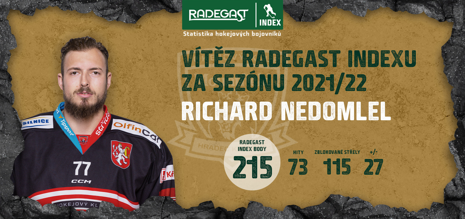Sezónu jeho tým zakončí bez medaile, on si z ní odnese ocenění pro nejzavilejšího extraligového válečníka. „Samozřejmě je to hezké,“ povídá Richard Nedomlel. „Hokej je ale týmový sport. A co si budeme povídat, vyměnil bych to za postup do semifinále.“ Hradec Králové narazil při putování play off hned ve čtvrtfinále. Osmadvacetiletý obránce místo pouti za titulem vypráví o perfektní základní část, v níž Mountfield HK zvítězil a ve které on sám kraloval Radegast Indexu. Vousatý obětavec se stal pátým vítězem fanouškovské statistiky, která v nejvyšší soutěži oceňuje bojovníky už od roku 2013.