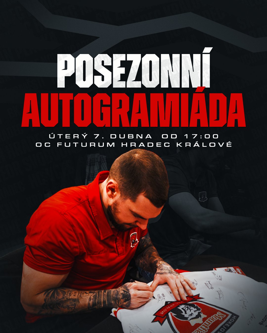 Kompletní kádr A-mužstva včetně trenérů se bude podepisovat v úterý 7. dubna v prvním patře obchodního centra (naproti kavárně Starbucks), a to minimálně po celou hodinu od 17:00. Každý z hráčů bude mít připraveny svoje podpisové kartičky, které budou pochopitelně k dispozici fanouškům. A nezapomeňte ani na společné fotky!