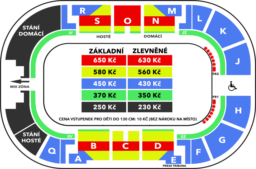 - Dětské vstupné: Děti do 130 cm výšky mohou navštívit utkání (bez nároku na sedadlo) za 10 Kč. Vstup na stadion jim bude umožněn hlavním vchodem, konkrétně označeným turniketem vedle pokladny č. 3. Vstupenky pro děti je možné zakoupit on-line, v Infocentru i na pokladnách ČPP Arény.