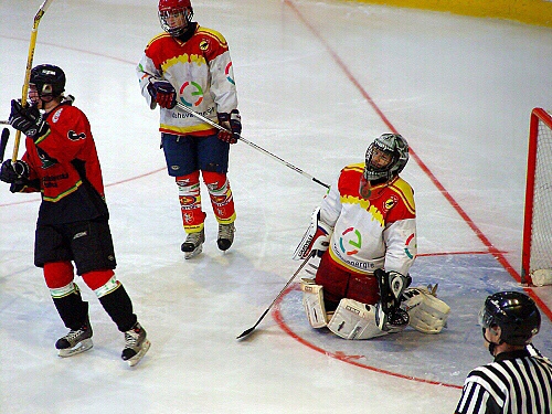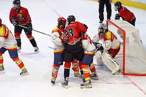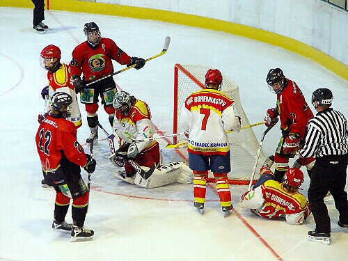 Petr Lochman vyráží střelu od modré, na dorážku je připraven Miroslav Hudák