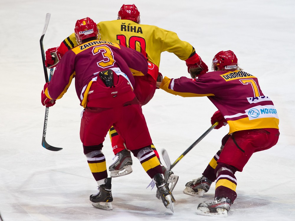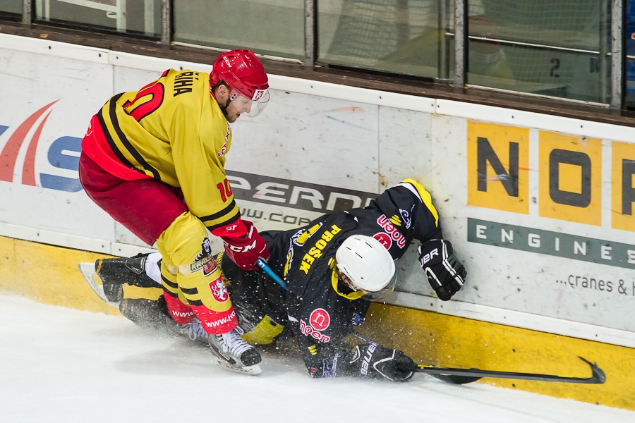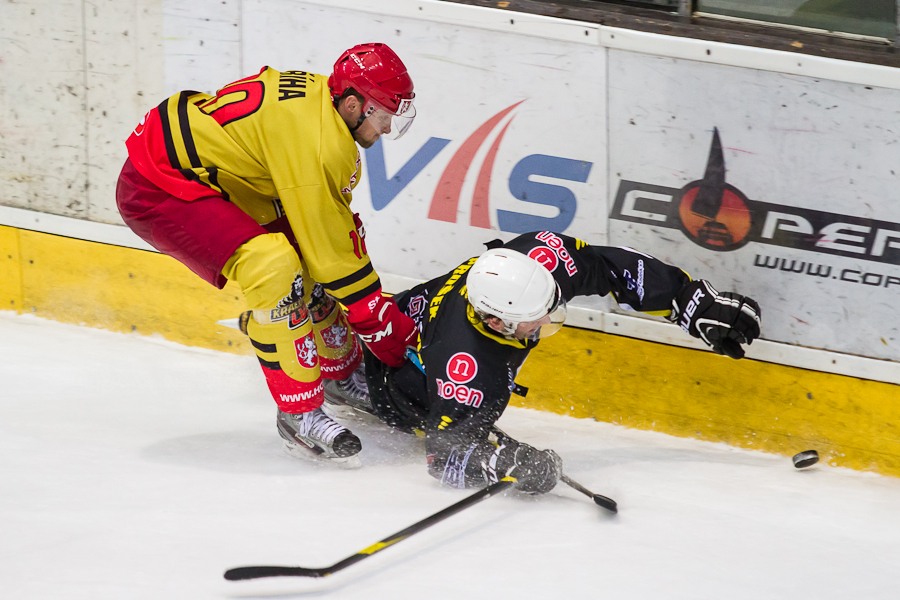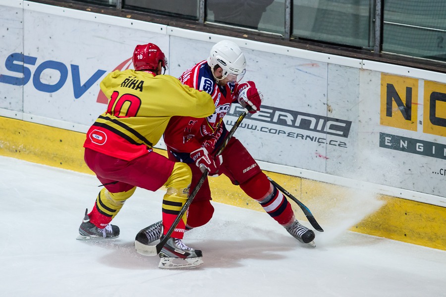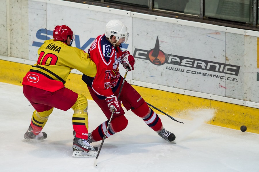 Vladimír Říha vymetá růžek nad ramenem Jakuba Čecha...
