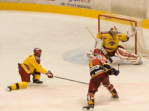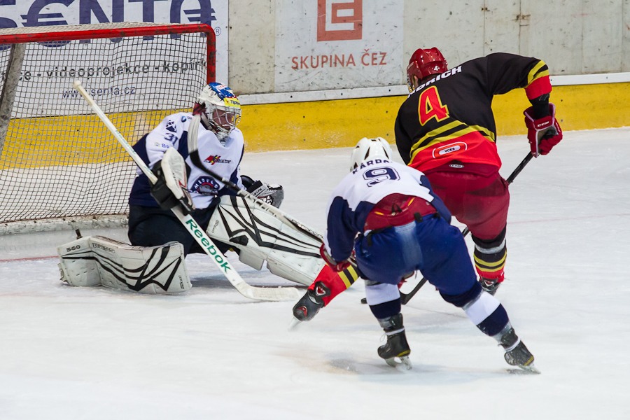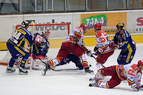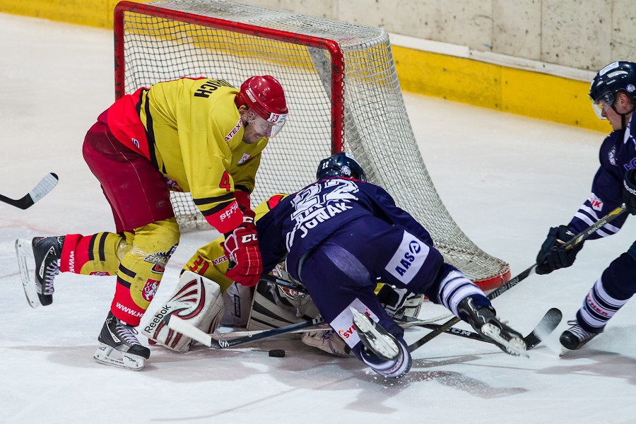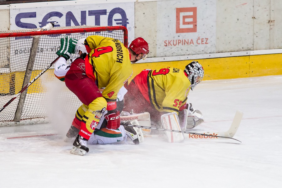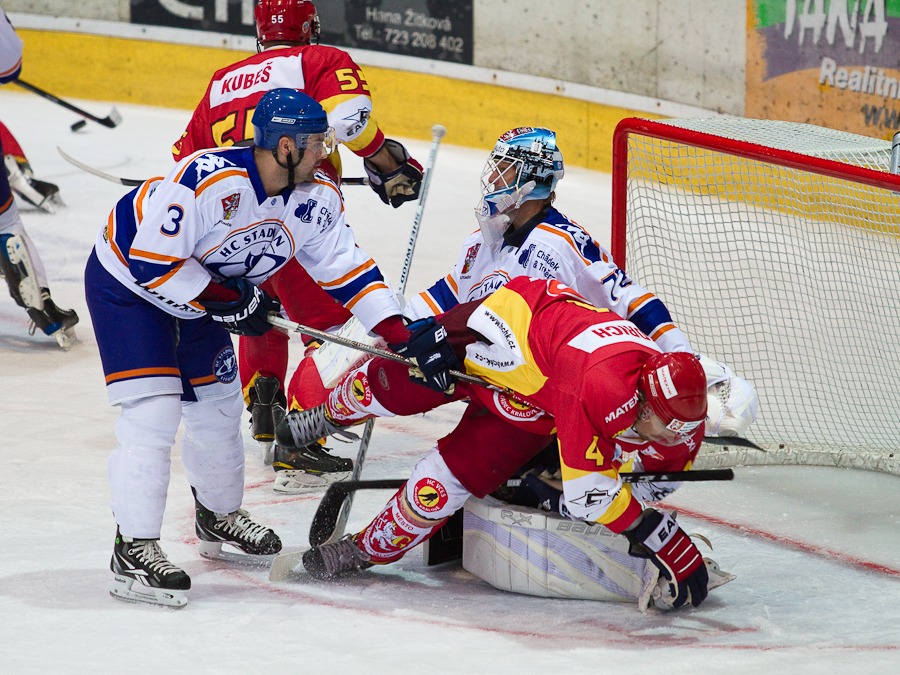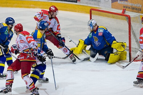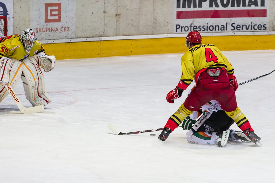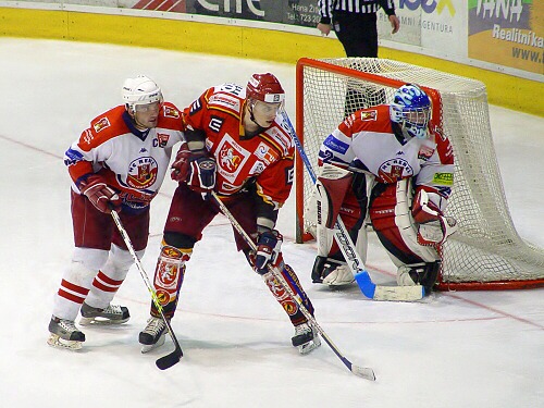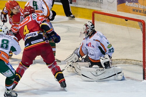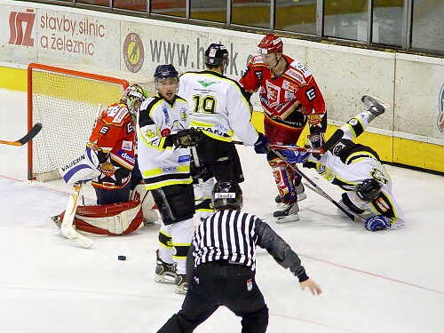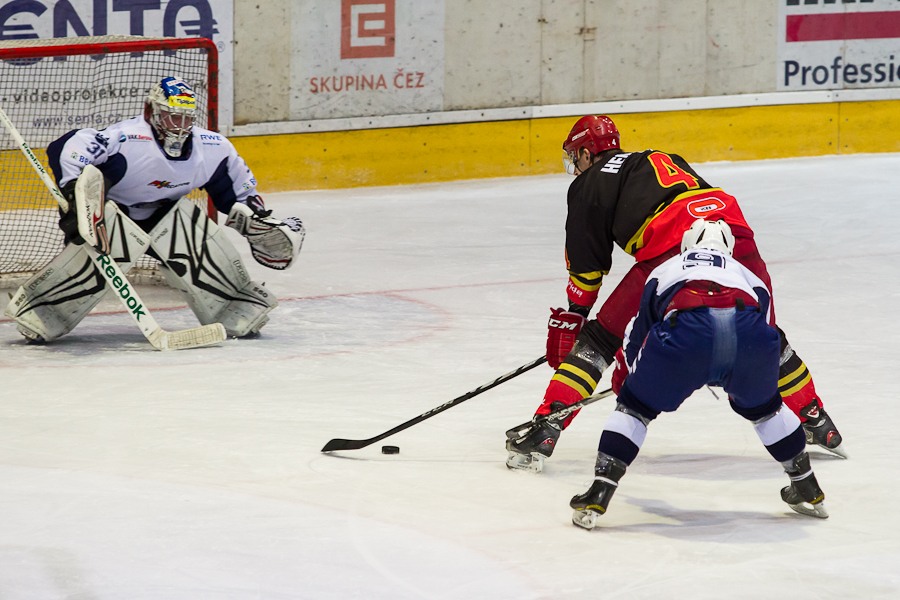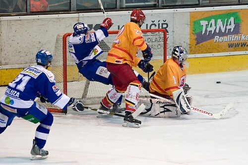 Jiří Hendrich s Martinem Koudelkou zakrývají výhled hostujícímu gólmanovi