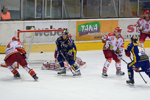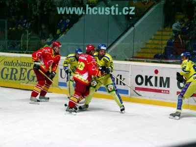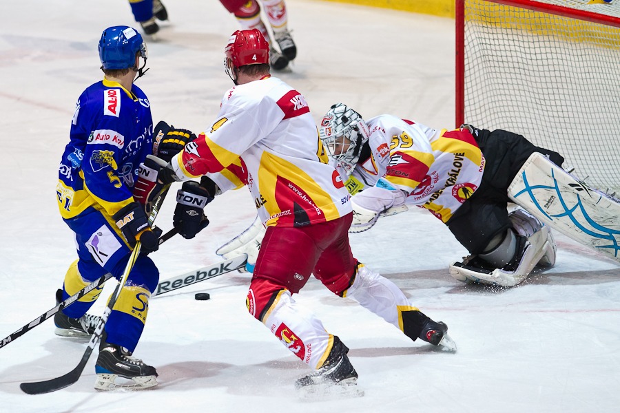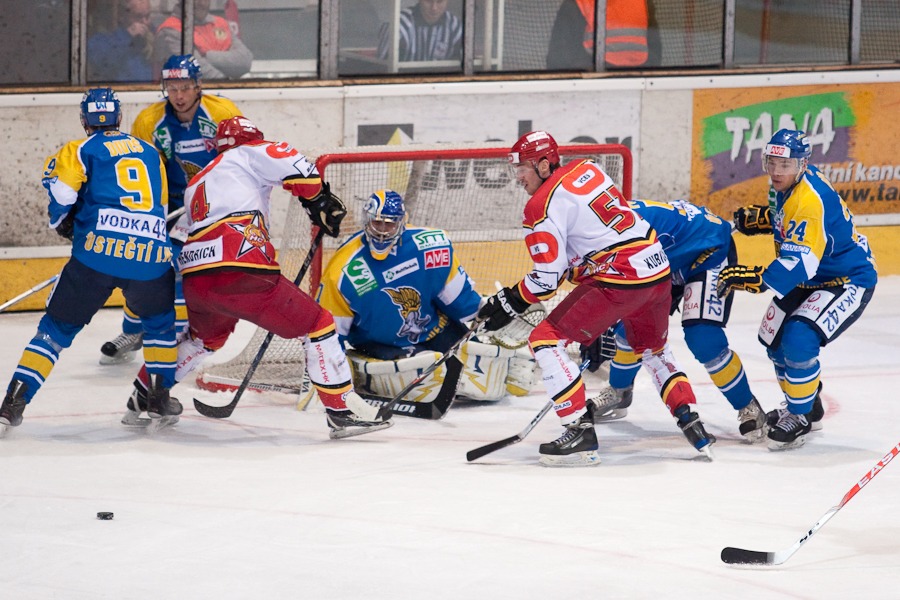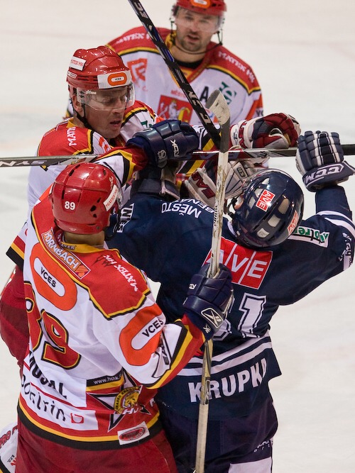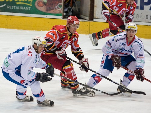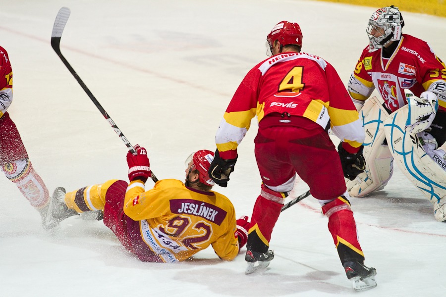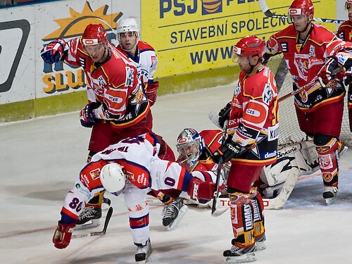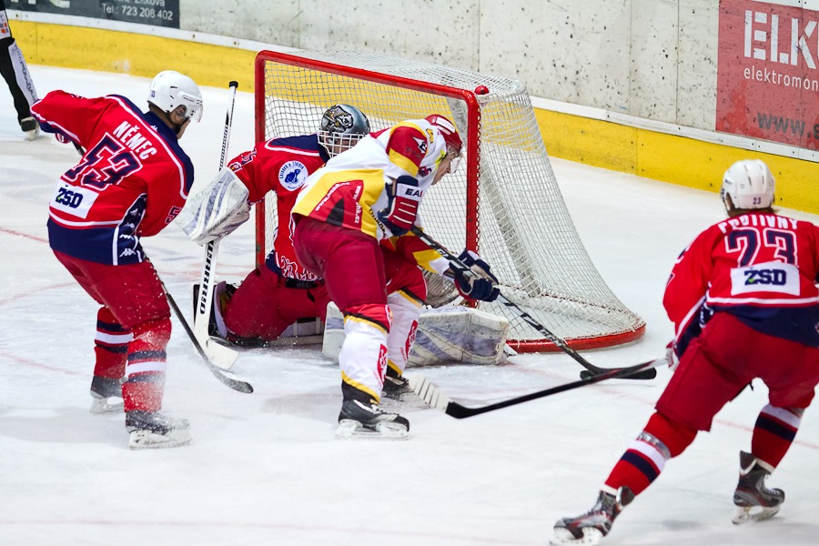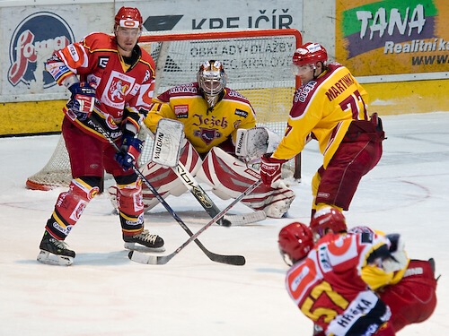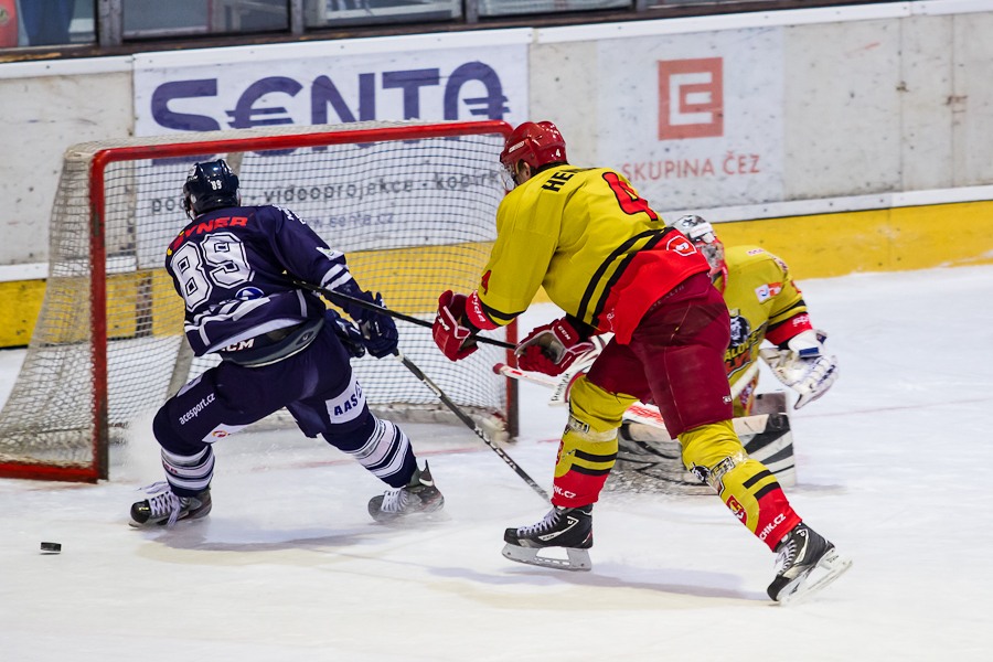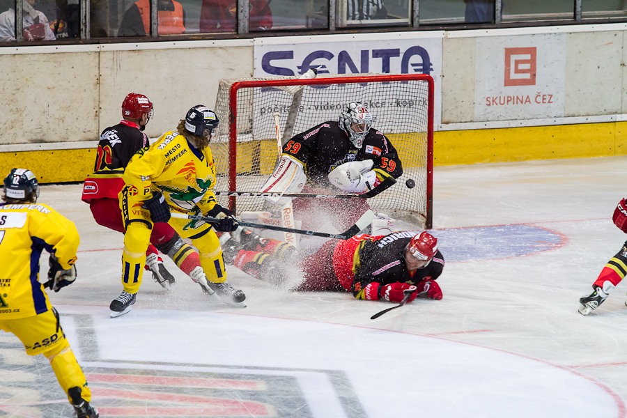 Jiří Hendrich s Martinem Koudelkou zakrývají výhled hostujícímu gólmanovi