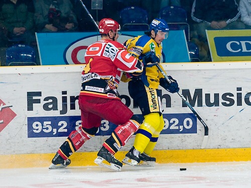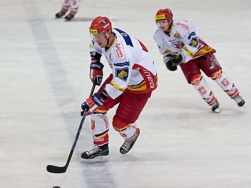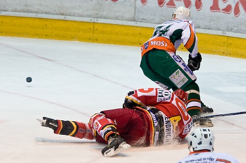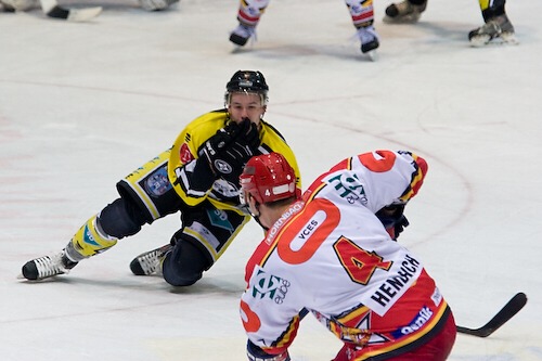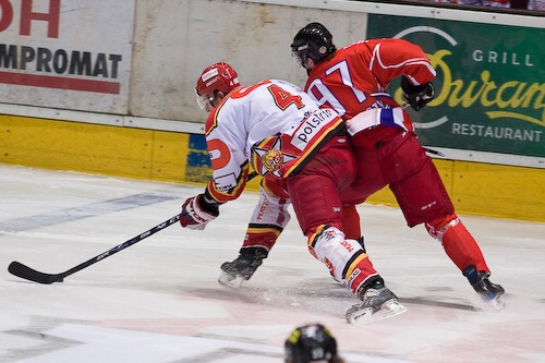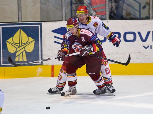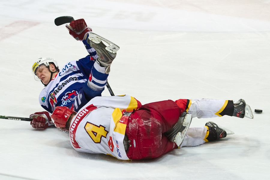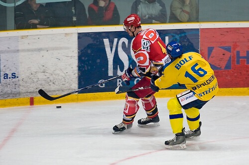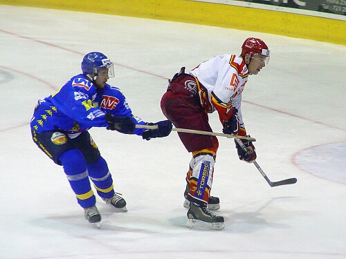Jiří Hendrich sledován Janem Ježkem zaváží kotouč