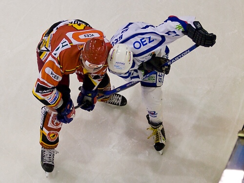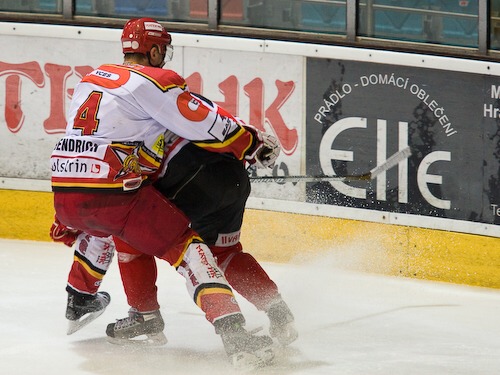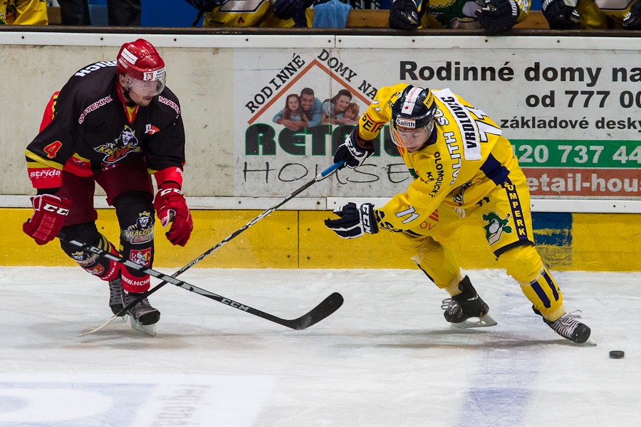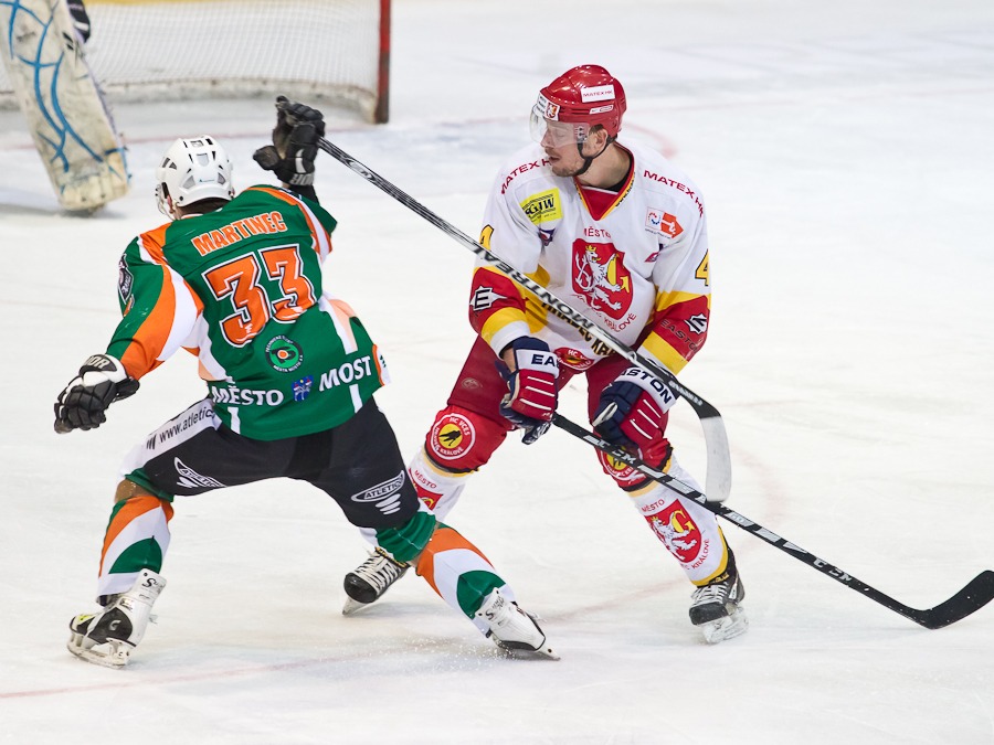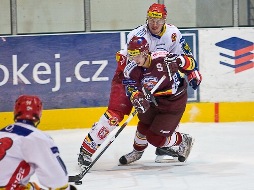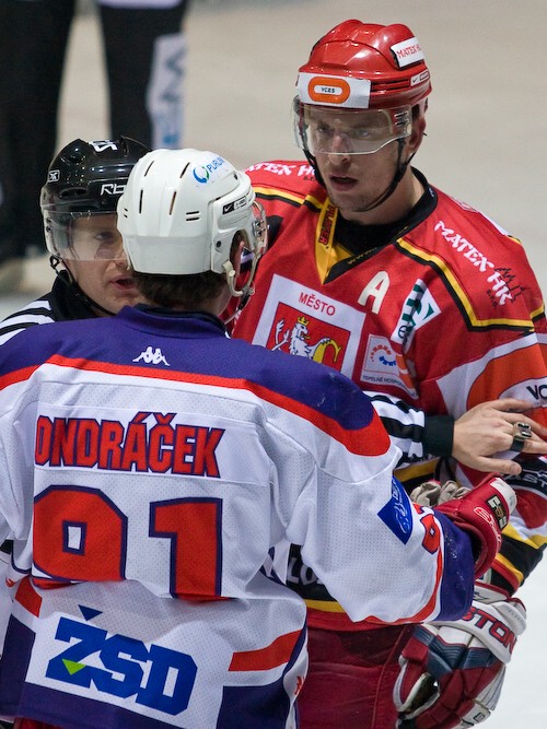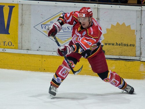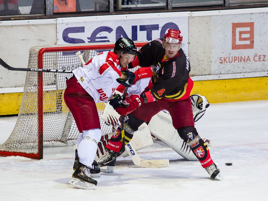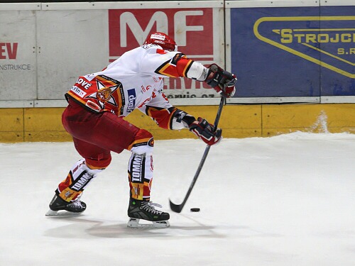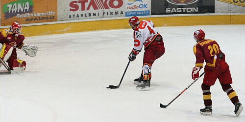Jiří Hendrich odpaluje puk před Lukášem Žalčíkem