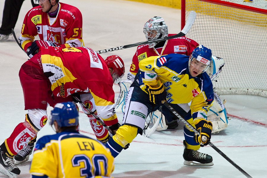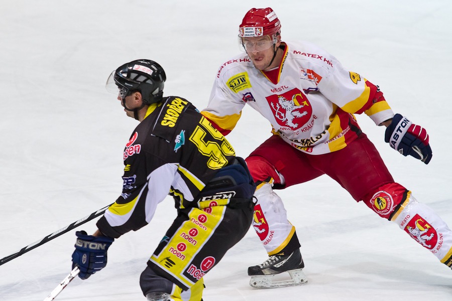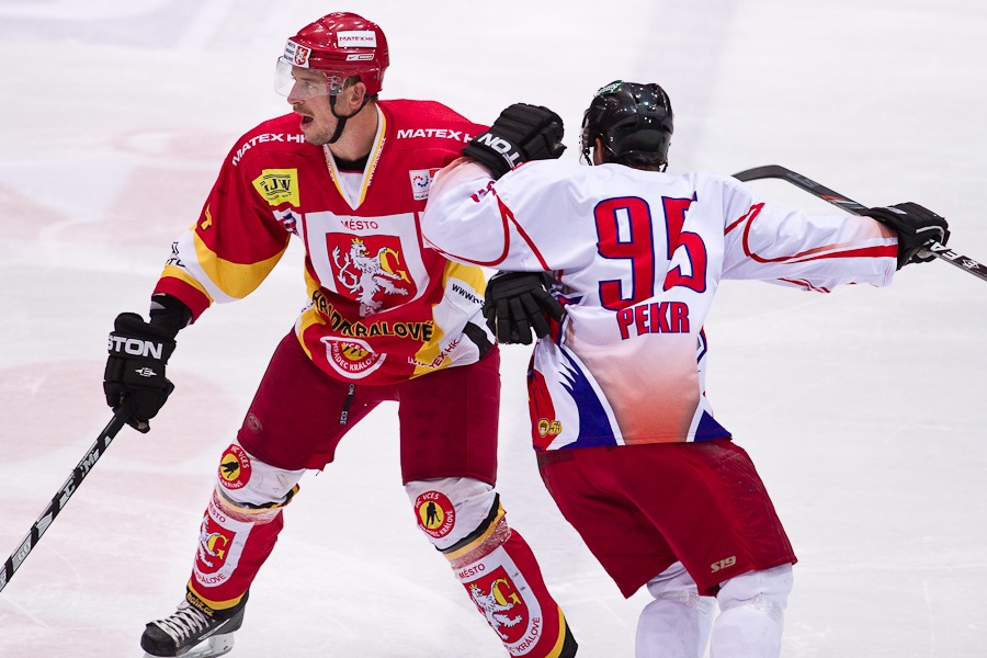 V samém závěru první třetiny byl v jasné šanci před Hylákám David Sochorek, ale nedal. Hradec hned z protiútoku vstřelil první branku Patrikem Beckem a vedl tak po dvaceti minutách 1:0.