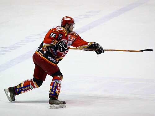 Boris Flamík se těžce zvedá z ledu po střetu s hráčem Ostravy