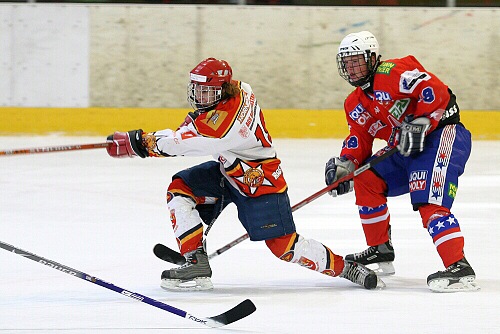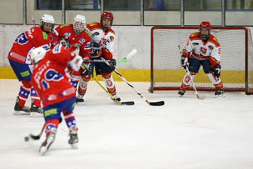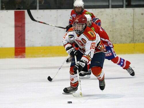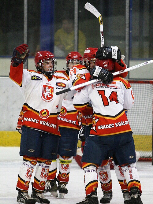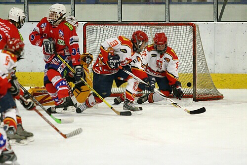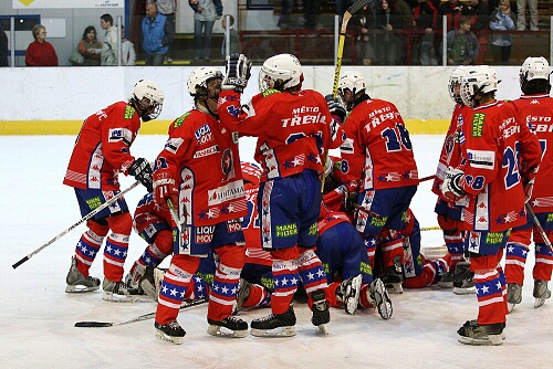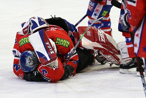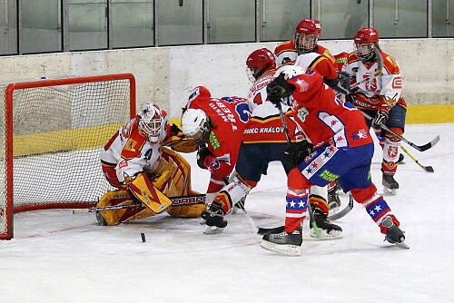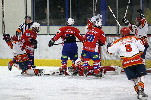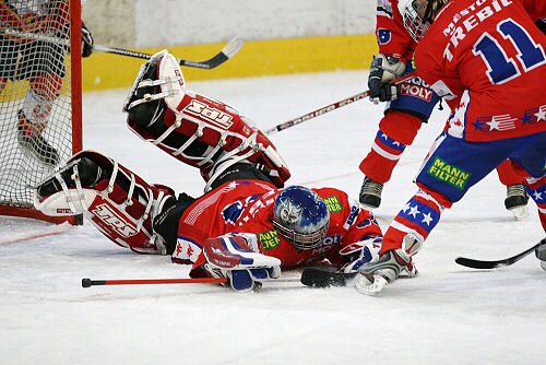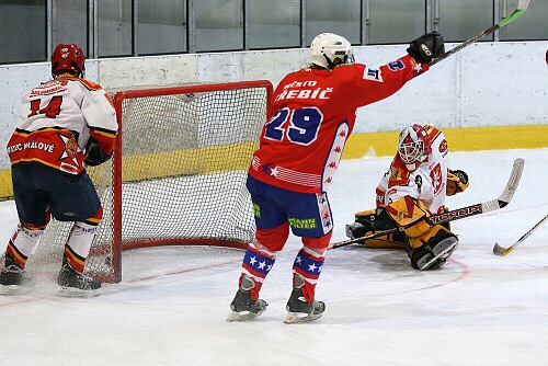 Brankář Tomáš Kotrla a hlavní rozhodčí Hribik