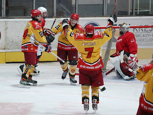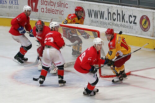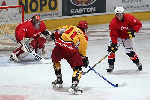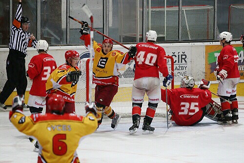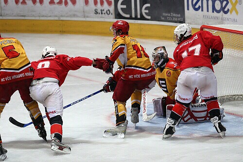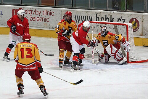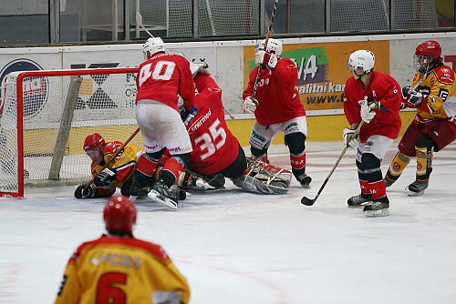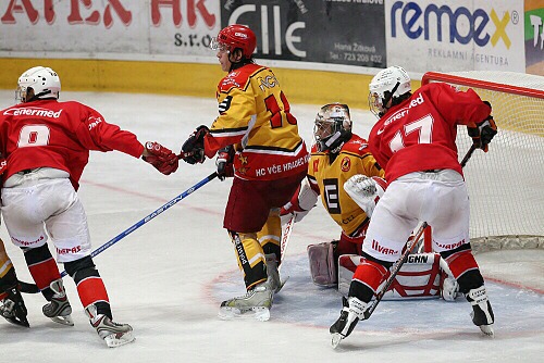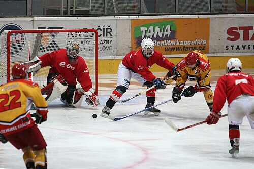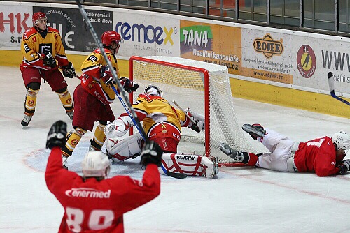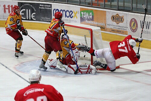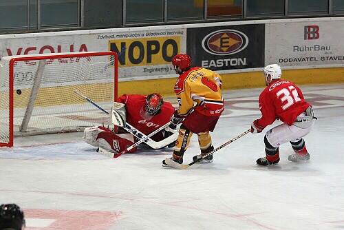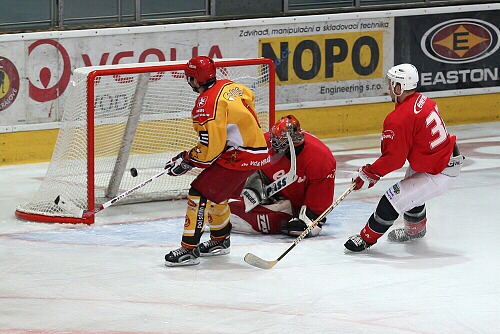 Tomáš Seidl dělá prostor před brankářem Brožem, avšak Znojmo dává gól