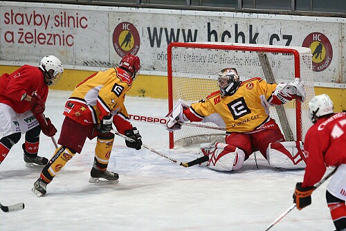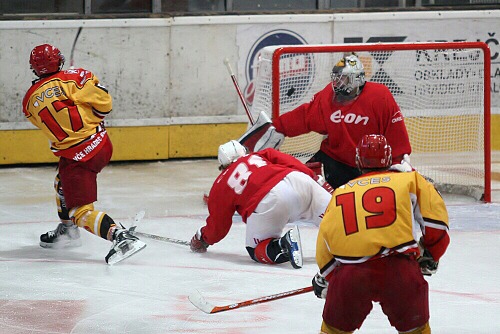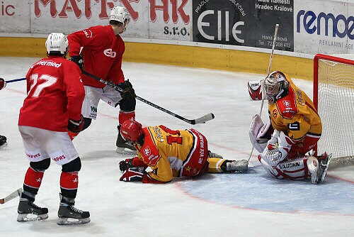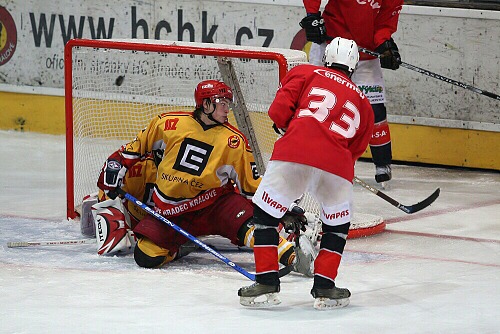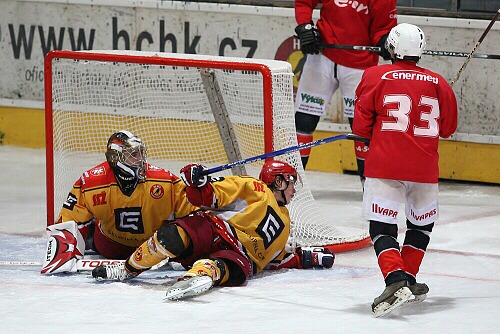 Ondřej Březina sleduje kotouč, který přechází brankovou čáru