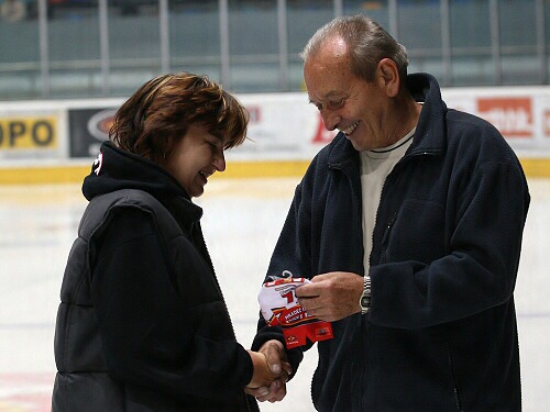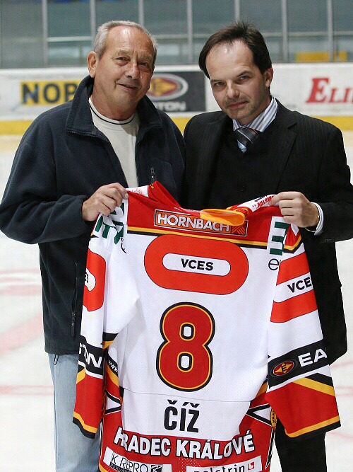 Generální manažer klubu Roman Višňák předal hradecké legendě Vojtěchu Čížovi dres s jeho číslem