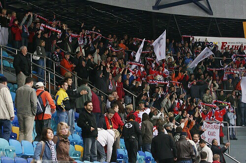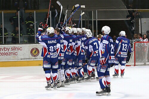 Přibližně dvě stovky fanoušků z Vrchlabí slaví vítězství 3:1