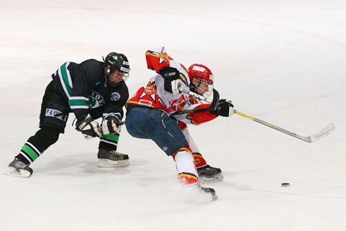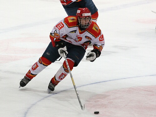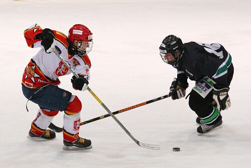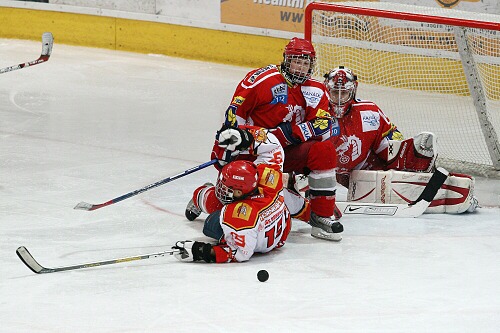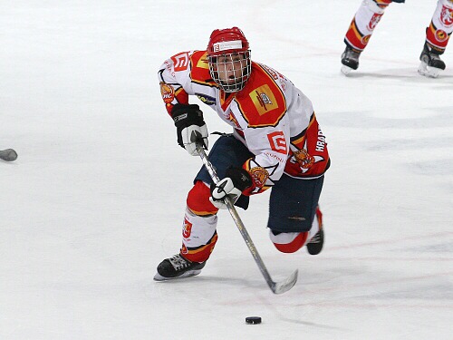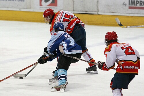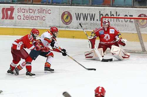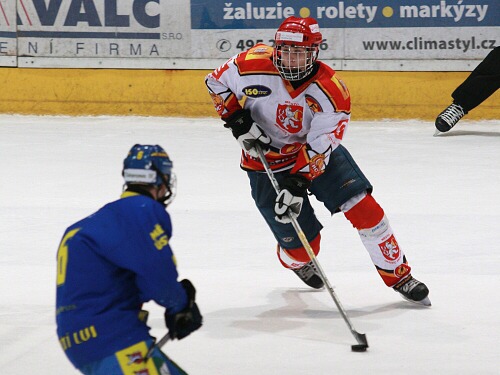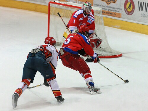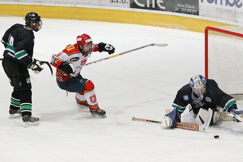 Vilém Juráň se pokouší usměrnit kotouč do brány bekhendem