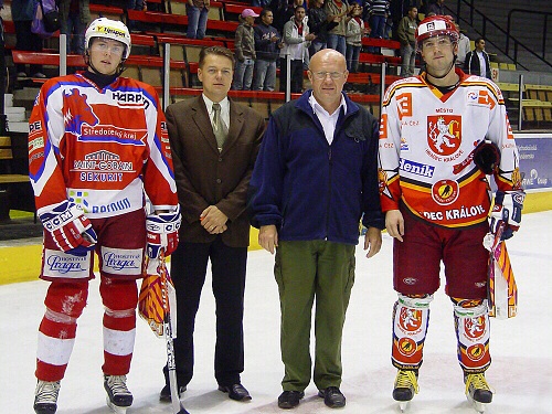 Nejlepším hráčem Hradce byl vyhlášen Petr Domin. Po jeho pravici primátor města Ing. Otakar Divíšek a předseda představenstva Ing. Boris Herman