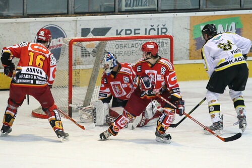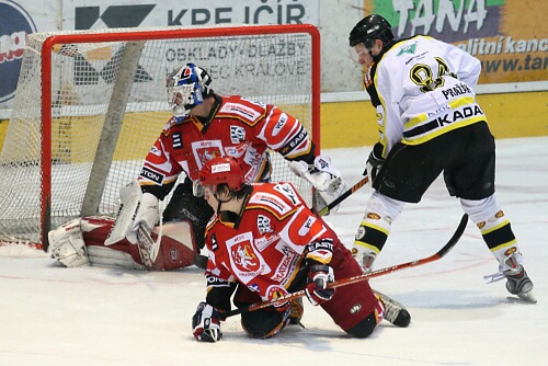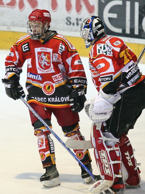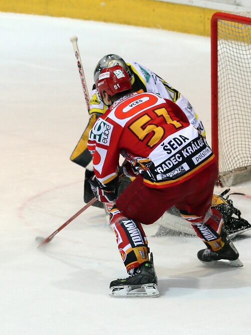 Jiří Kadlec sleduje kotouč v rohu kluziště