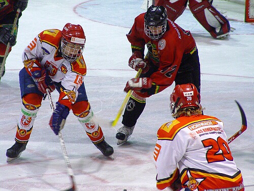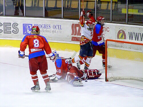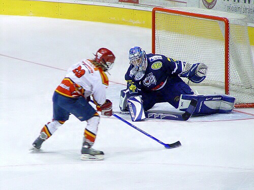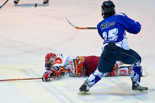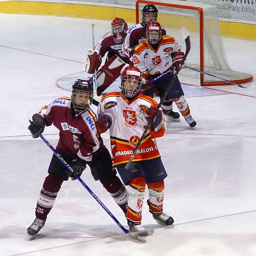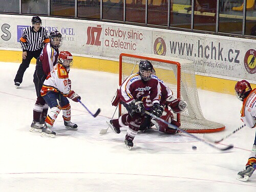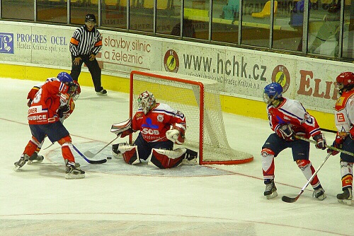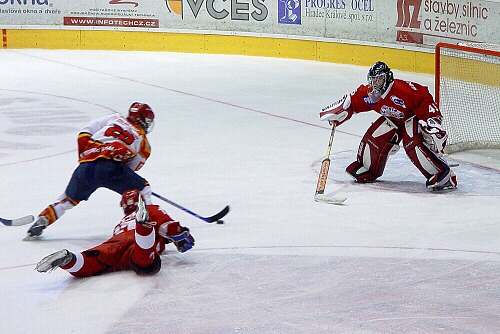 Ondřej Matějček střílí, Patrik Stehno připraven dorážet