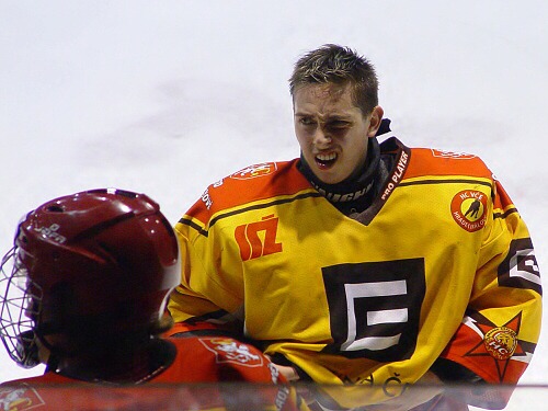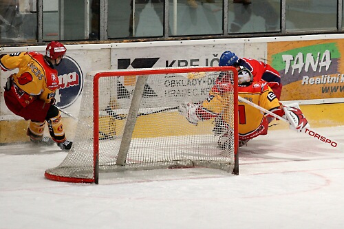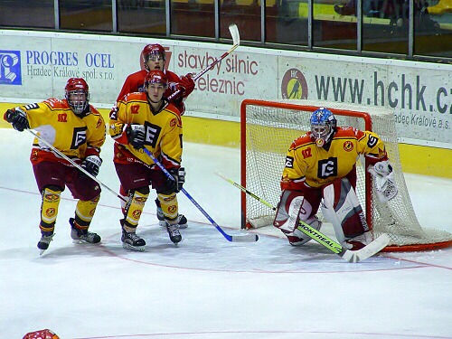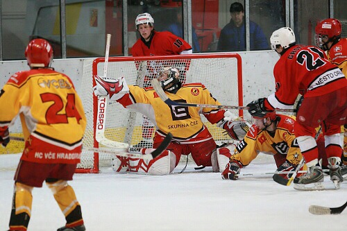 Miroslav Brož kryje střelu jednoho z hostujících hráčů