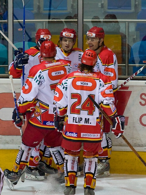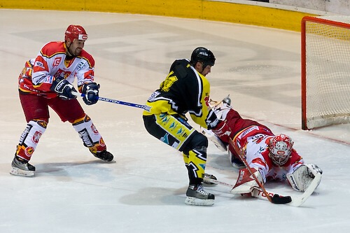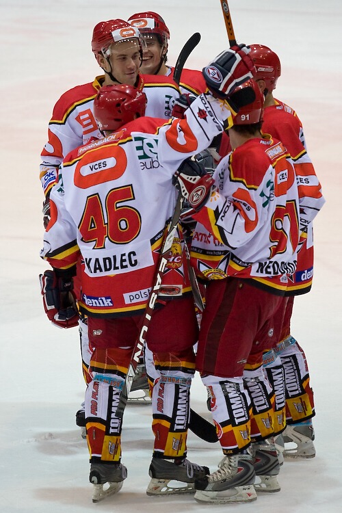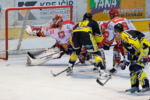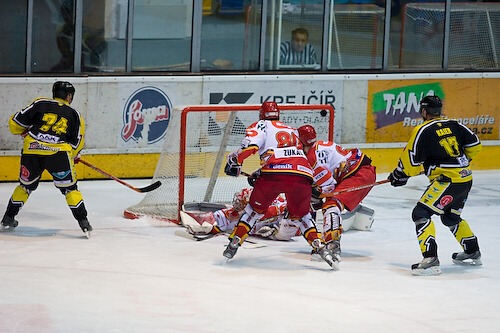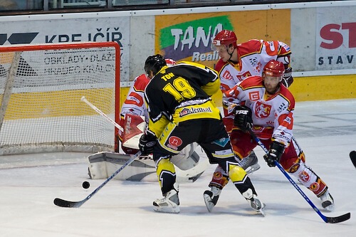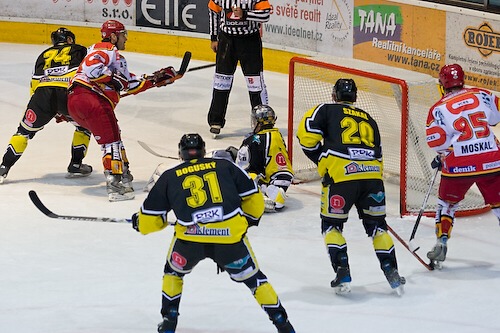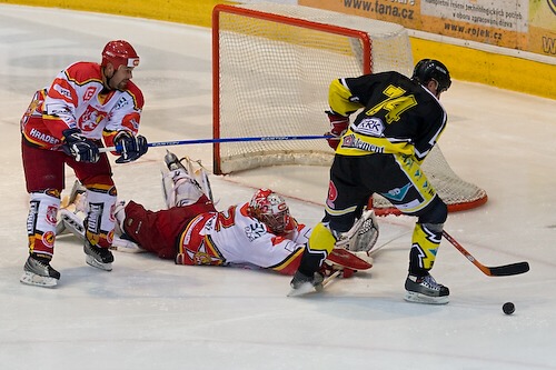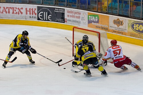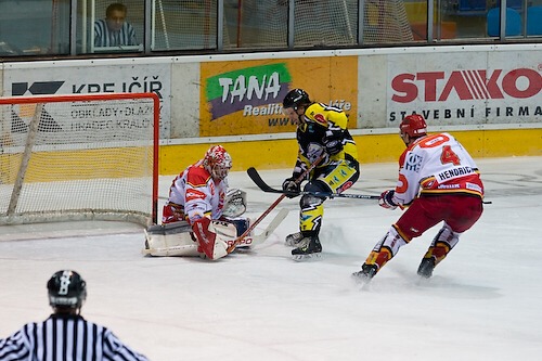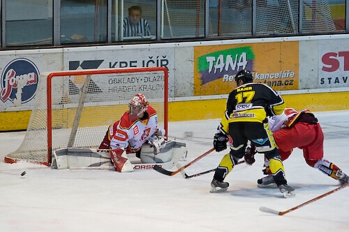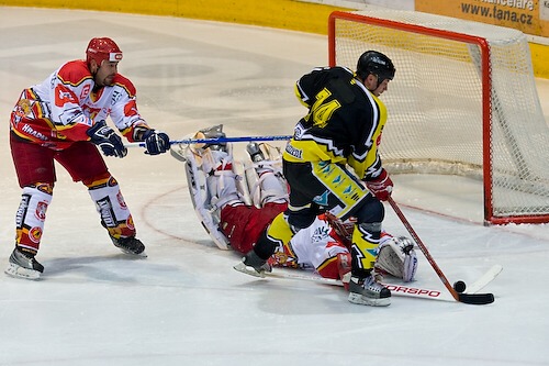 Jaroslav Roubík před brankářem Hanuljakem při brance Jiřího Kadlece