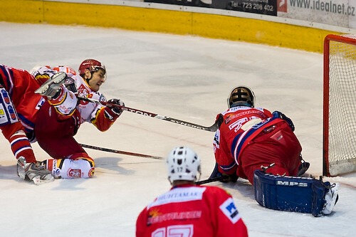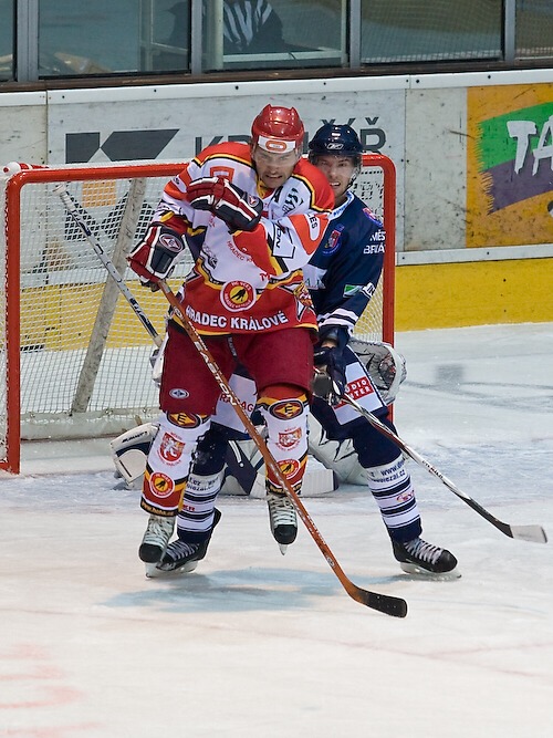 Pavel Suchý v nehokejové pozici před jihlavskou brankou