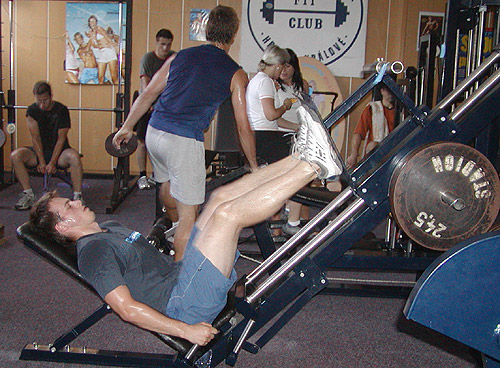 Patrik Fořt posiluje, sledují ho Jaroslav Roubík a Zdeněk Toužimský