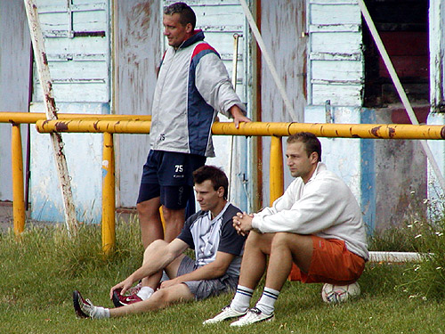 Jaroslav Roubík posiluje, vedle něj Patrik Fořt, v pozadí trenér Pavel Pazourek