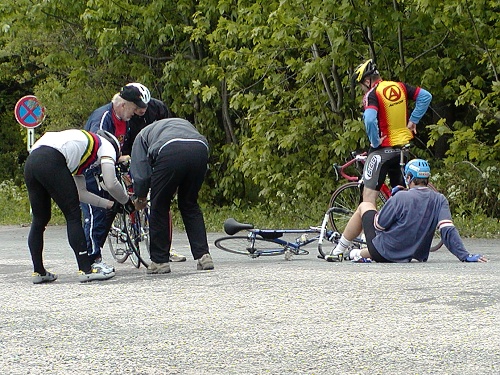 Trenér Ladislav Kolda pomáhá opravit kolo Petru Dominovi