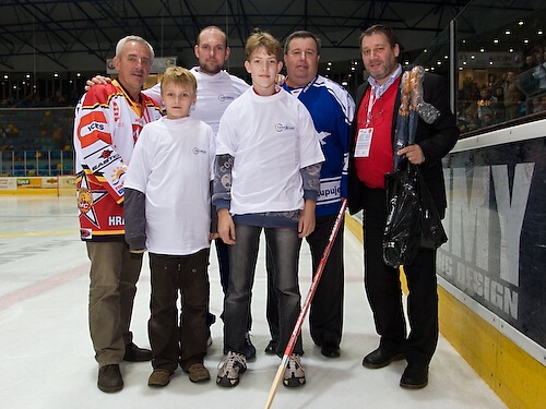 Hosté včerejšího utkání. Z leva sedí František Kaberle starší, herec Tomáš Töpfer a docent Leoš Heger.