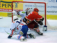 Na začátku druhé třetiny vychytal Brož agilního Kuriala, prostřelit ho nedokázal ani Burian. Ondrůj zneškodnil Budajův pokus. Neprosadil se ani Voříšek, který pálil od modré. Vítek zkoušel překvapit Brože střelou z otočky, branku však nevstřelil, stejně jako královéhradecký Březina, jehož střelu chytil Ondrůj efektivně do lapačky. Udeřit mohla dvojice Petr Burián – Jan Kurial, hosty však zachránilo od pohromy pouze štěstí. Drama přichystala minuta třicátá čtvrtá. Dvojnásobnou přesilovku využil hostující Jiří Šimoníček, který střelou zblízka k tyči dorazil tvrdou ránu Spudila od modré – 3:2. Uklidnit příznivce domácích mohla opět dvojice Burián – Kurial, druhý jmenovaný však zblízka těsně minul.