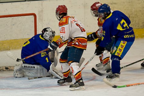 Ve třetí třetině se Ústečtí trochu osmělili a několikrát zahrozili před hradeckým brankářem Pavelkou. Ten měl starosti zejména s kapitánem hostů Martinem Žákem. Nakonec si však střelce Lvů pohlídal a ve svém prvním extraligovém zápase vychytal nulu. Ve 42. minutě zakončoval akci dva na jednoho Ondřej Vlček. Výhru Východočechů pak pečetil svým druhým gólem v zápase Jakub Novák, když potrestal chybnou rozehrávku jednoho z ústeckých beků.