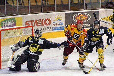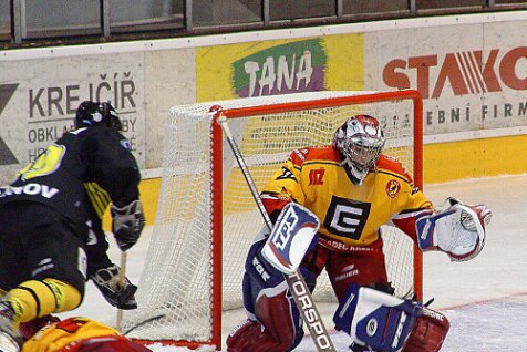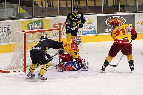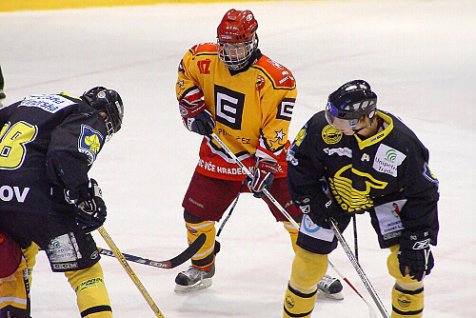 Poslední třetina už tolik vzruchu na obou stranách nepřinesla. Přesto měli Hradečtí ještě dvě možnosti přesilové hry, ale i přes střeleckou snahu se jim výsledek zkorigovat nepodařilo. Navíc ve 45.minutě měl Rýdl štěstí, když dělovka zpoza modré, kterou dostatečně nezkrotil, minula jeho klec. Ve 48.minutě ale v pohodě hrající hosté znovu udeřili, když ve vlastním oslabení Karel Kubát přebruslil hradecké zadáky a poradil si i s brankářem Rýdlem. Zbytek oslabení odehráli hosté precizně s pukem na svých hokejkách. Domácí, dostatečně smíření s osudem zápasu, již soupeře nijak výrazně nepotrápili. Výjimkou byl konec 55.minuty, kdy se dostali Hradečtí do brejku 2 na 1 a Martin Petružálek toto přečíslení vyřešil prudkou střelou do sítě brankáře Fikrta. To byl také poslední gólový zápis tohoto zápasu a tak Hradečtí po nepovedeném výkonu podlehli lépe hrajícímu soupeři rozdílem tří branek 3:6, ačkoliv skóre mohlo být pro domácí ještě méně příznivé. Na výhře hostí se nejvyšší mírou podílel Lukáš Rindoš, který v zápase získal 4 body za 2 branky a 2 asistence.