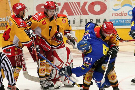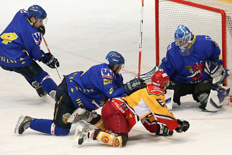 I do třetího dějství měli lepší vstup hráči Hradce. Ve 42. minutě Ropický ideálně našel Romana Dolanu, který uspěl střelou do protipohybu – 6:1. I poté měl brankář Hiadlovský mnoho práce, hosté se do útoku dostávali jen sporadicky. Přesto se jim podařilo hrozící debakl zmírnit, a to díky dlouhým početním výhodám. Nejprve z dorážky v přesilovce 4 na 3 uspěl Vlastimil Salač - 6:2, a v 52. minutě ve dvouminutové přesilovce 5 na 3 stanul na konci kombinace Tomáš Regner - 6:3. Ústí dvě kontaktní branky zdravě nabudily a před Brožem bylo mnohdy rušno. Hradec se o síly navíc připravoval vlastní nedisciplinovaností. Ale v závěru zápasu už domácí komplikace nepřipustili, jelikož dohrávali ve výhodě dvou mužů v poli. Nakonec si připsali důležité vítězství v boji o záchranu.